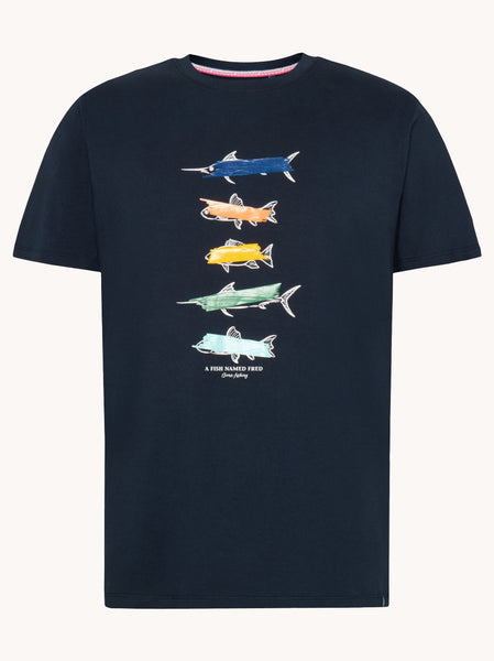 T-shirt van A Fish Named Fred in het wit met een print van vijf verschillend gekleurde vissen. Het lijkt alsof er strepen verf over de vissen heen zijn gemaakt, het ziet er heel vrolijk uit! Een typisch kledingstuk van het merk A Fish Named Fred. Het t-shirt is gemaakt van 100% organisch katoen.